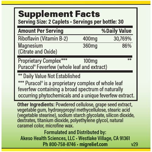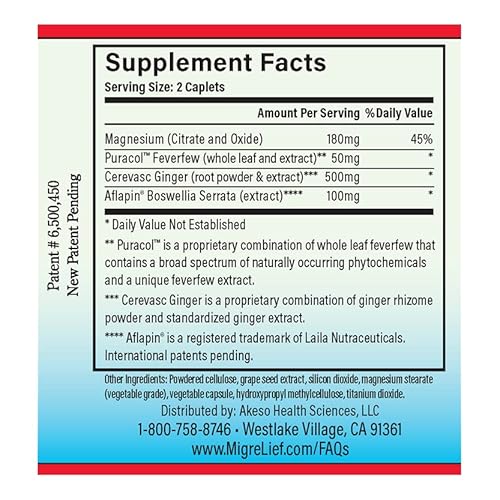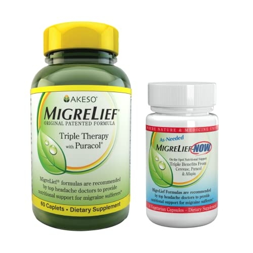 MigreLief Nutritional Support Kit for Migraine Sufferers includes MigreLief Original Formula (60 caplets) & MigreLief-NOW Fast-Acting (14 caplets). Contains magnesium citrate, ginger root powder and other effective ingredients. This powerful combination is designed to provide daily nutritional support while offering extra help when needed. MigreLief Original (daily formula) is Akeso Health Sciences’ original trusted formula for teens and adults who suffer from migraines, a safe and effective nutritional option - a daily nutritional supplement formulated for migraine sufferers ages 12 and older. Magnesium, Riboflavin and Puracol* Feverfew. MigreLief-NOW fast-acting (as-needed formula) is Akeso’s fast-acting nutritional supplement for migraine or headache sufferers, formulated to provide comprehensive nutritional support when you need it most… NOW. Don’t let a migraine ruin your day - when you need help fast, try MigreLief-NOW. Proven ingredients. Formulated by migraine supplement pioneer, based on scientific evidence, Akeso's Chief Scientific Officer Curt Hendrix was the first to discover the unique combination of Magnesium, Riboflavin (Vitamin B-2) and Puracol Feverfew for migraine sufferers. Made in the USA, safe and effective - MigreLief products are drug-free, vegetarian and non-GMO. Does not contain butterbur, wheat, gluten, salt, soy, milk or dairy, nuts, corn, caffeine, artificial flavorings or preservatives. Ingredients are tested by independent 3rd party laboratories. Manufactured in certified facilities in the United States.