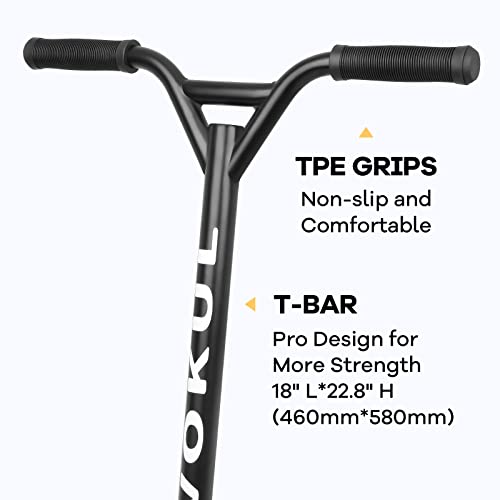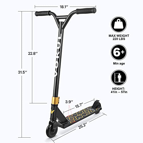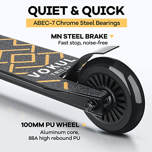 【STABLE PRO SCOOTER】Made of 6061 aircraft aluminum with Reinforced Heat Treated Forged Plates in Deck. ABEC-9 bearings allow a stable and smooth riding. 【SCOOTER WHEELS & DECK 】The high resilience durable 3.9”(100mm) wheels are made of PU + PC and can provide you a softer landing. 20”L 4”W matte deck with cool pattern will help beginner rider get a wider room and learn stunts more safely. Rubber grips provide soft and comfortable grip when sliding. 【THE COOLEST KID AT THE PARK】While everyone else rattles around on other scooters, your kids will be whizzing around on their VOKUL scooter with its fresh graphics, smooth wheels and responsive brake. Because that’s what a stunt scooter kid in training truly wants – to look like their heroes! 【EFFORTLESS ASSEMBL TOGETHER】We’ve heard a lot complains about stunt scooters arrived damaged! So this pro scooter comes securely and gift design packaged to avoid upset. When it arrives, all you need to do is to tighten the 3-bolts clamp to put it together. 【CUSTOMER SERVICE】Any question when you receive the stunt scooter, please contact us freely. Good solution will be offered for you.