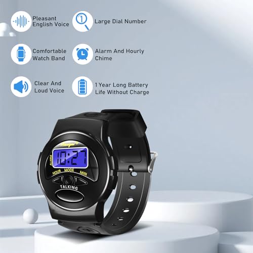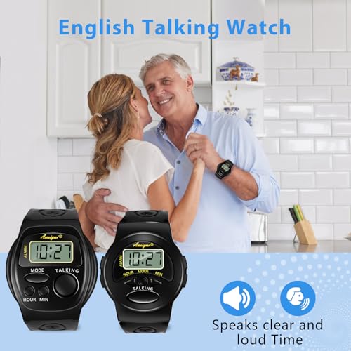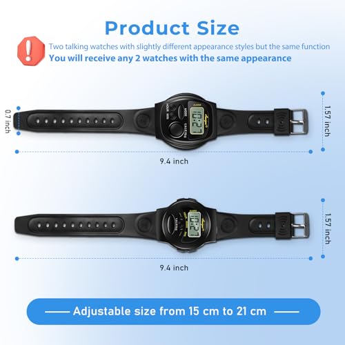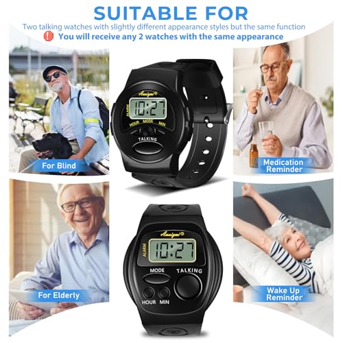 ✅ What Will You Get - Value Pack of 2 circular appearance talking watches (random style,slightly different appearance with same function),also equipped with 4 button batteries and 2 small screwdrivers for watch disassembly ✅ Easy to Read and listen - Awaiymi talking watches for the blind features a large and clear screen,making it the perfect choice for people with low vision,blindness,or visual impairments.Our talking watches are made with lightweight plastic casing and soft silicone straps,with each watch weighing only 0.9 ounces,providing a lightweight and comfortable wearing experience for the wearer.This talking watch has been optimized for sound clarity,with clearer sound when close to the ear ✅ Easy Button Operation - Awaiymi talking watch for blind people broadcasts hours and minutes in clear American English voice and comes with an hour timer and alarm clock with just a gentle press,you can easily experience the passage of time.The user-friendly design ensures convenience in operation.Our talking watches for the blind women can be used as a medication reminder,alarm clock for the elderly,or a voice alert for visually impaired or low vision individuals ✅ Three Modes for Easy Switching - Comes with an English instruction manual,easy to operate.The talking watch for visually impaired has functions for time,alarm,and voice broadcasting.It can be used as a medication reminder,an alarm clock for the elderly,and a voice alarm for the visually impaired or those with low vision ✅ Excellent Gift - Awaiymi talking watches for blind people make a great gift for elderly people with visual impairments or blindness.They need a reliable and convenient way to know the time.This is a practical and thoughtful gift suitable for various occasions