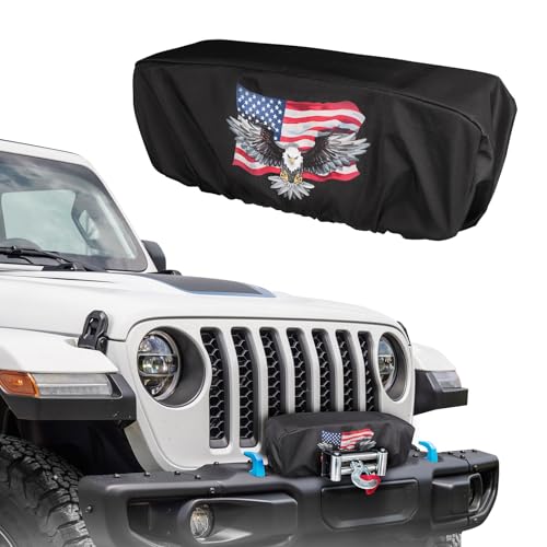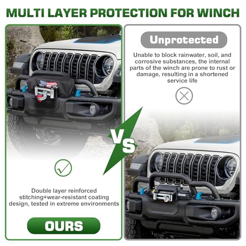 【Military level protection, fearless of harsh environment】The winch cover is made of 600D high-density nylon fabric, which has excellent waterproof, dust-proof and UV resistance performance, effectively resisting rainstorm, sandstorm and long-term exposure, providing all-weather protection for the winch. 【Super durable, tear and wear resistant】Double layer reinforced stitching+wear-resistant coating design, tested in extreme environments, can withstand high-strength friction and impact, extend the service life of the winch, and save frequent replacement and maintenance costs. 【Quick installation】This winch cover has been upgraded with an elastic closure and a national flag bald eagle pattern, which can tightly fit various winches without the need for tools, making disassembly and storage easy and convenient. 【Newly upgraded protective lining】Unlike traditional winch covers, high-density nylon fabric is added internally to form a double-layer protective structure, effectively blocking rainwater, mud, and corrosive substances, preventing rusting or damage to internal parts of the winch, extending its service life, and keeping your winch in the best condition at all times. 【Wide application】This winch cover can easily handle off-road exploration, outdoor rescue, navigation operations, and daily vehicle protection. Adapting to various vehicle models and winch models, it has become an essential equipment for off-road enthusiasts, outdoor workers, and car owners, providing reliable protection anytime, anywhere.