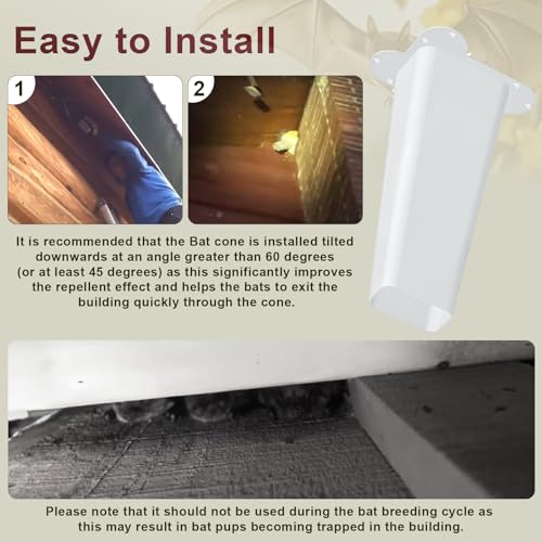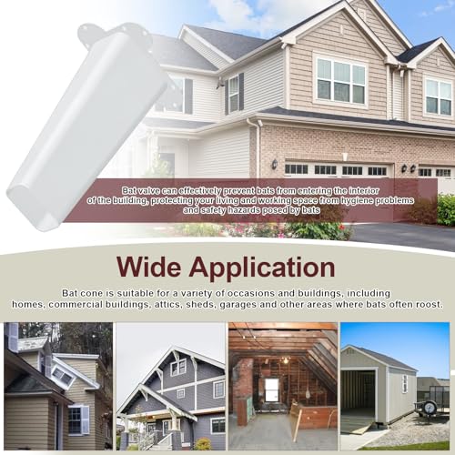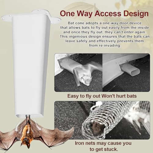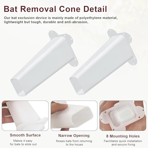 [Bat Exclusion Device Material] Bat exclusion device is made of polyethylene material, sturdy and durable, with good weather resistance and UV resistance, it can work stably in all kinds of bad weather conditions, and it can be reused, saving you the trouble and cost of frequent replacement. [One Way Access Design] Bat cone adopts a one-way door device that allows bats to fly out easily from the inside and once they fly out, they can't enter again. This ingenious design ensures that the bats can leave safely and effectively prevents them from re-invading. [Easy to Install] This bat removal cone is cleverly designed and easy to install, it is recommended to install the bat one way exit valve tilted downward at an angle greater than 60 degrees (or at least 45 degrees), which can significantly improve the repellent effect and help the bats to quickly leave the building through the conical tube. [Package Includes] 2 Bat cones and 16 screws, measuring approximately 5.9 x 2 inches and weighing only 30 grams, the bat door one way not only effectively repels bats, but also protects the surface of the building from damage and maintains the building's aesthetics, making it an ideal choice for expelling bats both indoors and outdoors. [Wide Application] Bat removal device is suitable for a variety of occasions and buildings, including homes, commercial buildings, attics, sheds, garages and other areas where bats often roost. Please note that bat trap should be avoided during the bat breeding cycle as it may result in bat pups being trapped inside the building.