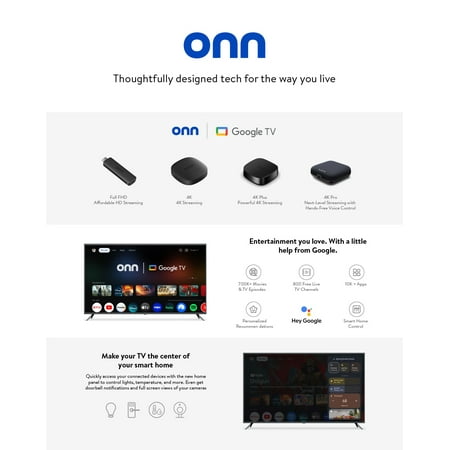 Enjoy next-level streaming at an affordable price with the onn Google TV 4K Pro Streaming Device. This powerhouse streaming device delivers uncompromising performance and stunning visuals, transforming your TV into a premium entertainment hub. Immerse yourself in vivid colors, sharp contrast, and cinematic quality with stunning 4K Ultra HD and Dolby Vision. Experience theater-quality, multidimensional sound with immersive Dolby Atmos Audio. Powerful performance with 3GB of RAM, is 50% more than the 4K Plus model, for super smooth app performance, fast navigation, and seamless multitasking. Enjoy incredibly smooth, buffer-free streaming and gaming with blazing-fast Wi-Fi 6 Connectivity or use the optional Ethernet Port for the feastest, reliable connectivity. Store even more of what you love with the expansive 32GB of storage, double the storage of the onn 4K Plus, so you can download more apps, games, and content. Navigating your entertainment is effortless with Google TV, seamlessly organizing all your content in one convenient place. Access a universe of over 700,000 movies and shows, plus 10,000+ apps, including Netflix, YouTube, Disney+, and over 800 free live TV channels. Finding what you want is easier than ever, with hands-free voice control with Google Assistant, find movies, shows, and more - just by asking. And, never lose your remote again thanks to the handy Find My Remote feature. The onn 4K Pro offers versatile power and connectivity with AC 100-240V input and a USB 3.0 port for media and storage. Setup is quick and easy with everything you need included in the box: the 4K Pro Streaming Device, remote control (2 AAA batteries), HDMI cable (4.92ft), AC adapter, and Quick Start Guide. This device is for use in the USA & Puerto Rico only. Some apps, content, and/or features may not be available in all countries. Subject to availability. Subscription, download, or purchase may be required for viewing.