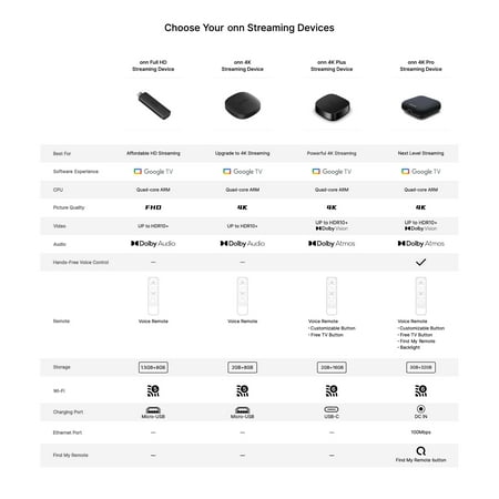 Compatibility – USA & Puerto Rico Only Stunning 4K Ultra UHD & Dolby Vision – Vivid colors, sharp contrast, and cinematic quality Google TV for Seamless Entertainment – Effortlessly browse and discover content, all in one place Your Favorite Apps – 700K+ movies/shows, 10,000+ apps including Netflix, YouTube, Disney+ and 800+ free live TV channels Voice Remote with Google Assistant – Easily search for shows, control your TV, and get answers using just your voice Find My Remote Feature – Locate your remote with voice commands Immersive Dolby Atmos Audio – Theater-quality, multidimensional sound Expansive 32GB Storage – Double the storage of the onn 4K Plus so you can download even more apps, games and content Super Powerful Performance - 3GB Ram is 50% more 4K Plus model for super smooth app performance, fast navigation and seamless multitasking Blazing Fast Wi-Fi 6 Connectivity – Incredibly smooth, buffer-free streaming and gaming Wired Ethernet Port Compatibility – For the most stable and reliable internet connection, ideal for critical streaming Versatile Power & Connectivity – AC 100-240V input + USB 3.0 port for media and storage Quick & Easy Setup – Get started in minutes with everything you need included in the box Included in the Box – 4K Pro Streaming Device, remote control (2 AAA batteries), HDMI cable (4.92ft), AC adapter, and Quick Start Guide
