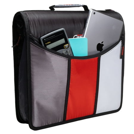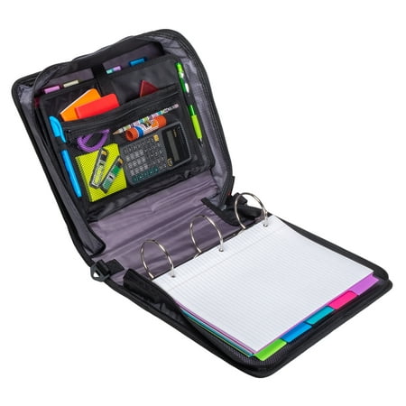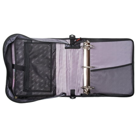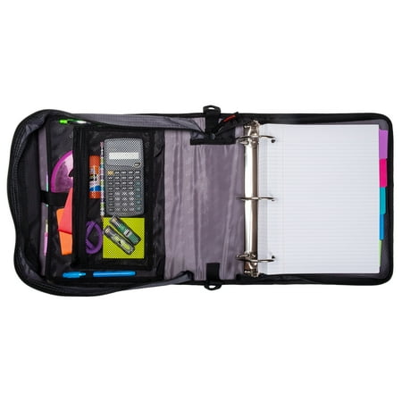 Keep yourself organized and your papers protected in the Case•it Binder. The D-156-B has a standard ring size of 3 inches that holds up to 600 sheets. With that much room, keeping up with all of your classes is a breeze For even more organization this binder comes with an expanding file folder that helps you separate 5 subjects easily. Access your files easily when the binder is closed with the patented U-shaped opening on the gusset. With no shortage of interior and exterior zippered pockets, you can keep more items contained in one place. The exterior zipper pocket is great for storing a couple of pencils or pens for quick access. Keep your schoolwork from falling out or getting damaged with our durable zippered gussets. The zippers are self-correcting too Just slide them all the way back down the gusset and they will fix themselves. Conveniently the gusset is made with a ripstop material that keeps tears from spreading. Take your classroom with you with the handle and shoulder strap that comes included. Assembled product Height 12.99 inches x Assembled Product Width 13.11inches x Assembled Product Length 3.74 inches Case•it 3-inch O-ring has a capacity of up to 600 sheets Assembled product Height 12.99" H x Assembled Product Width 13.11" W x Assembled Product Length 3.74" L Organize up to five subjects with the expanding file folders on the interior The U-shaped zippered opening allows you to access your files right from the gusset without having to open the entire binder A unique angled zipper keeps the gusset out of the way while writing. Included is a handle and shoulder strap for convenient carrying Pockets galore for additional storage